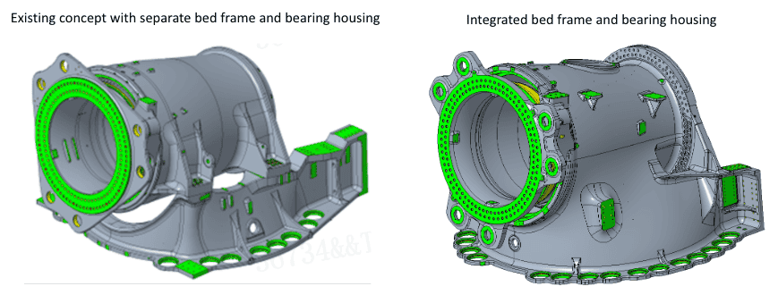 By playing with stress flow and integrating main bearing housing and bed frame it has been achieved to reduce the total mass of main bearing housing and bed frame by 25%